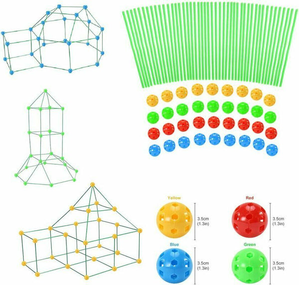 Building Fort Building Kit: includes 102 Tent support(12.2" long), 72 multi-color fixed balls (1.38" diameter),1×blue tent cloth.Our DIY tent kits allow your child to build forts of all shapes and sizes(Tent cloth included)!