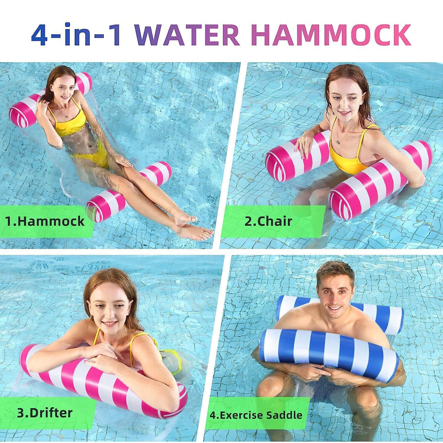 【Multifunctional】The 4-in-1 design can be converted into a hammock, lounge chair, Drifter, and exercise saddle . Therefore, you can change your posture on the water hammock as needed. The floating hammock is ideal for a series of recreational and leisure activities such as chatting resting reading in the water.