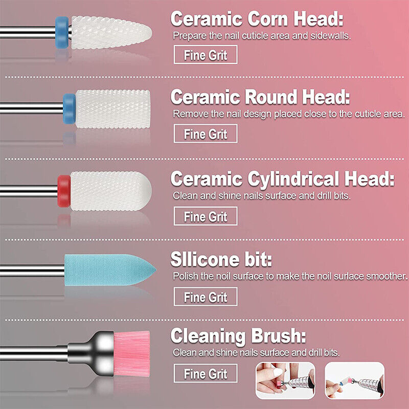 - You can get 6pcs ceramic nail drill bits, 8pcs tungsten steel bits, 1pcs silicone drill bit and 1pcs brush.