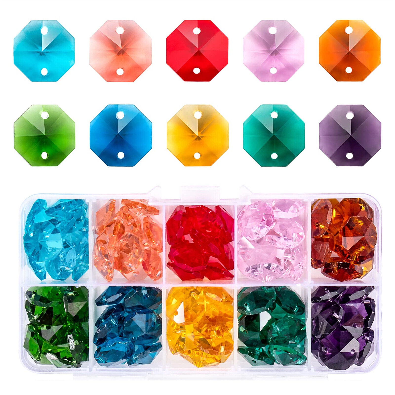 20 x octagon beads mixed colours crystal glass suncatchers mobiles 14mm 2 holes