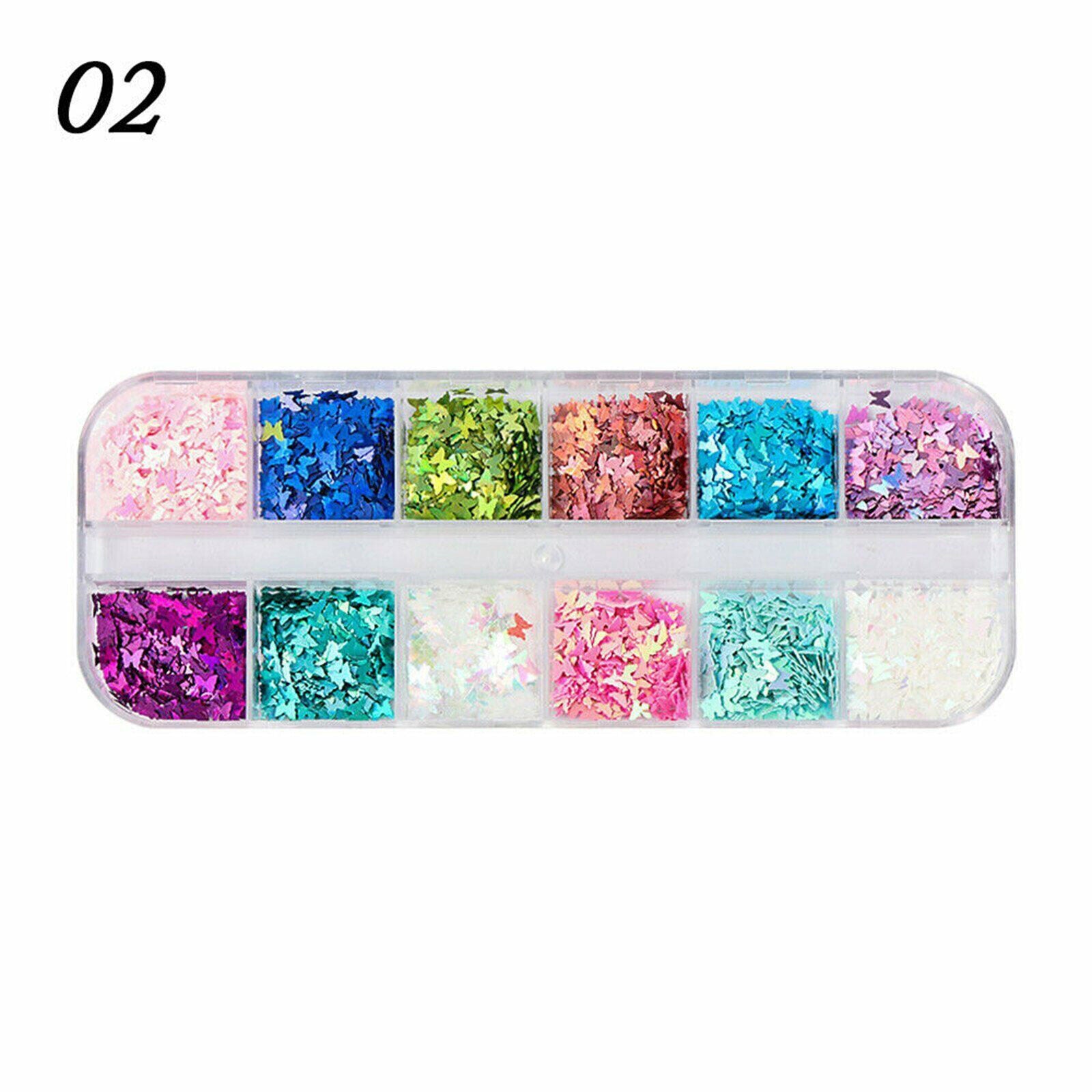 2PCS 12 Grids Butterfly Shape Nail Flakes 3D Holo Laser Glitter Sequin Nail Deco