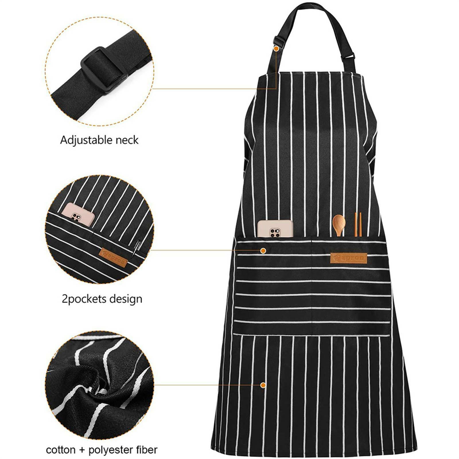 【Apron With 2 Pockets 】Our kitchen apron has 2 pockets in the middle of apron, and spacious divided pocket can give you enough place to hold into meat thermometer, grill slips, phones, recipe cards ,seasoning packets, recipe cards, pen and phone etc